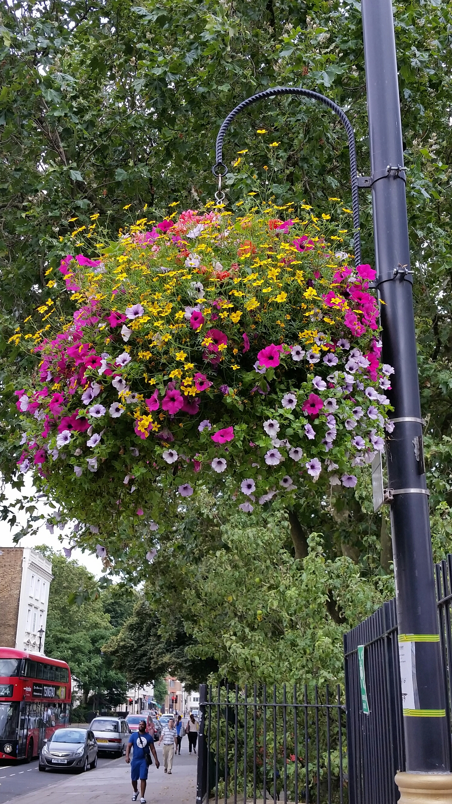 Wandered down tothe Thames. So many expensive cars – ferraris, mercs, rollers in plenty. There’s still money here. There’s also rubbish, bags of it lying around. Some has escaped the bags and just lies around. And then there’s the beauty of flowers and hanging baskets.