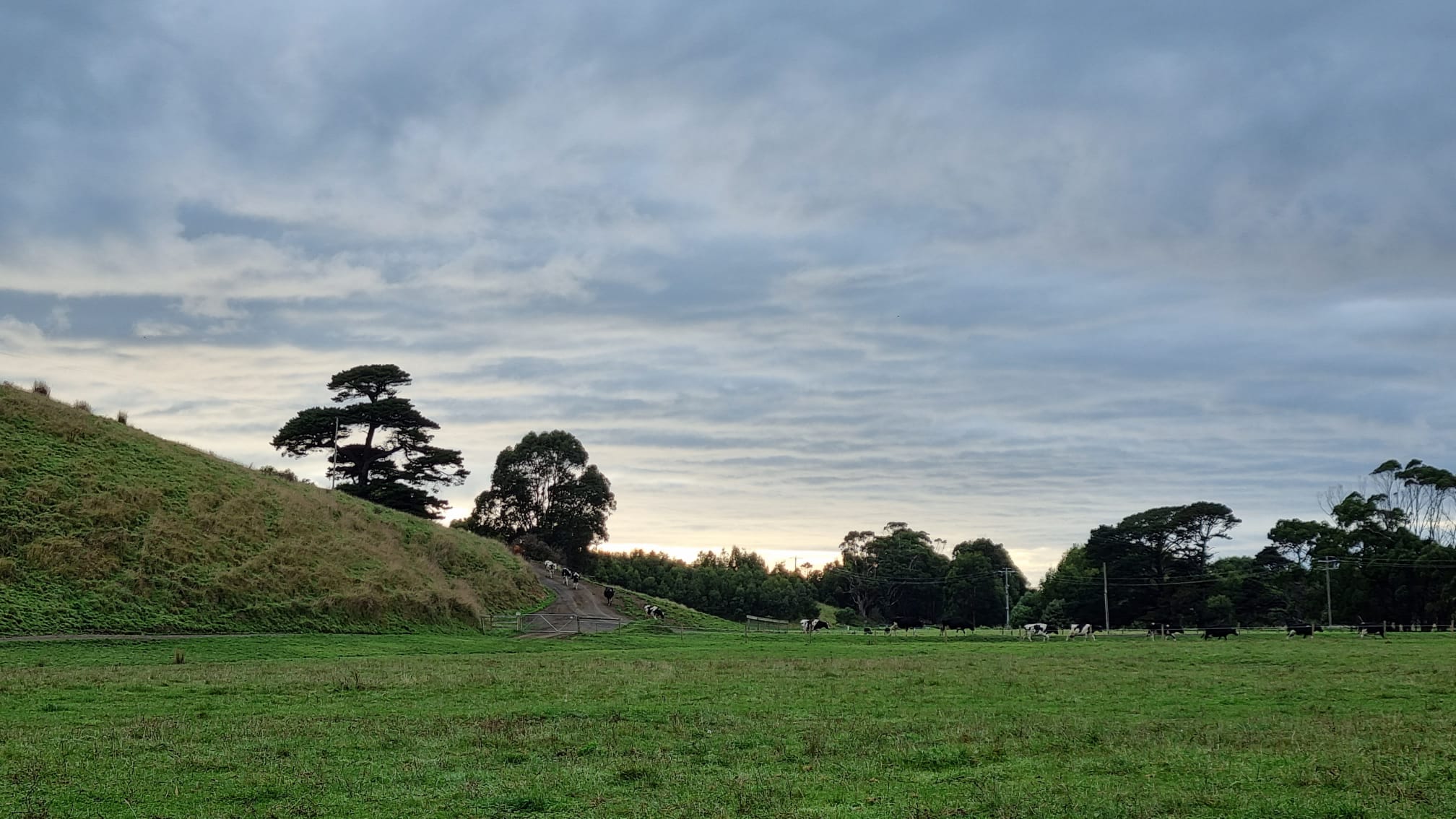 Then the road started heading inland and we went on a narrow winding road, up the Otway Ranges – sorry, the Great Otway Ranges (I was forgetting that this is Vic). Beautiful forest, magnificent scenery and up and down. Slow going. Finally for the day, we arrived at Apollo Bay, where we stayed in a farmer’s field – which had strong evidence of cows being there recently.