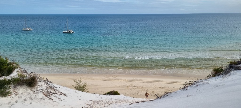Is the largest sand island in the world. It is about 120 km (75 miles) long and 25 km (15 miles) at its widest point. We got picked up from our caravan park at 7.15 am and taken to the catamaran we were doing the crossing in. It took about 30 minutes and the water was pretty flat.